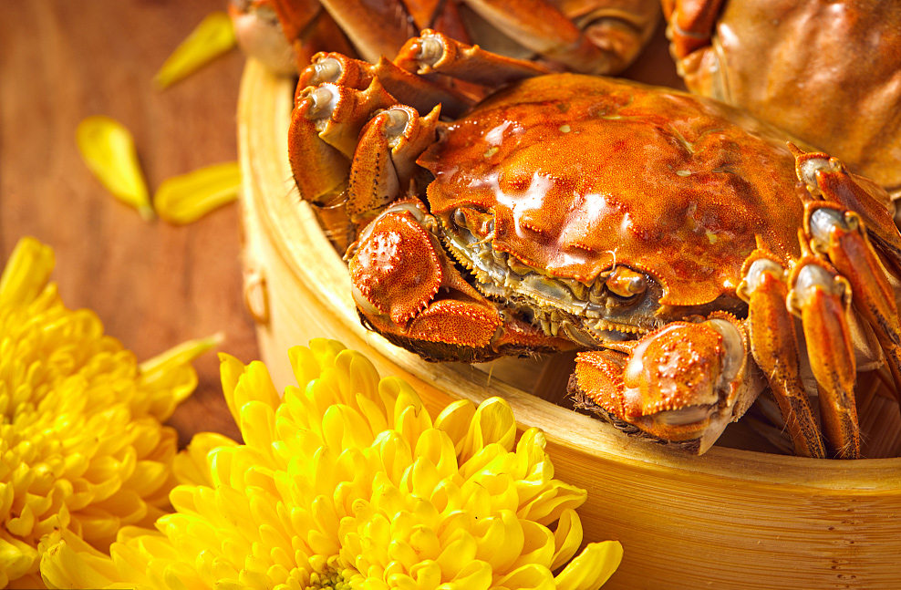 1、用左手虎口張開,食指與拇指分別夾住正面大閘蟹的兩側, 將大閘蟹翻過身來,用右手將2個大閘蟹鉗分別讓左手的食指和拇指緊緊按住,其他部分握住大閘蟹的腿,使大閘蟹不得動彈。 2、左手食指按住準備好的進口香草,右手拿著繩子的另一頭。 3、將繩子對著大閘蟹的鉗子連同腳、身子一起捆緊,扎成十字型,放松左手和右手的繩子,將繩子在大閘蟹的尾部擰幾圈。 4、將蟹草穿過貼著臍的香草,用剪刀減去多余的香草,一只美觀的大閘蟹就綁好了。